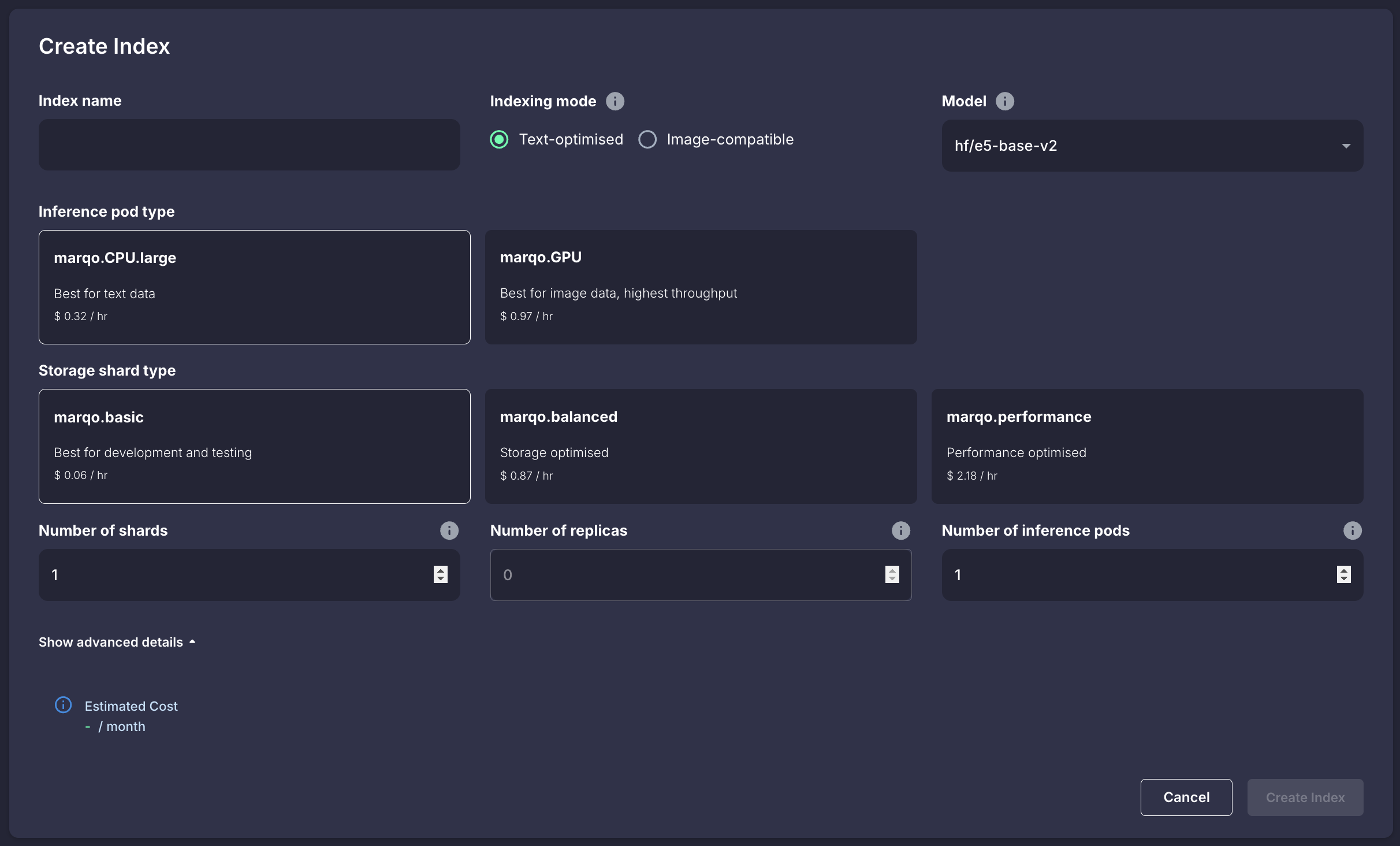 To create an index on the Cloud UI, simple click 'Create Index' and you'll be greeted with the following options: