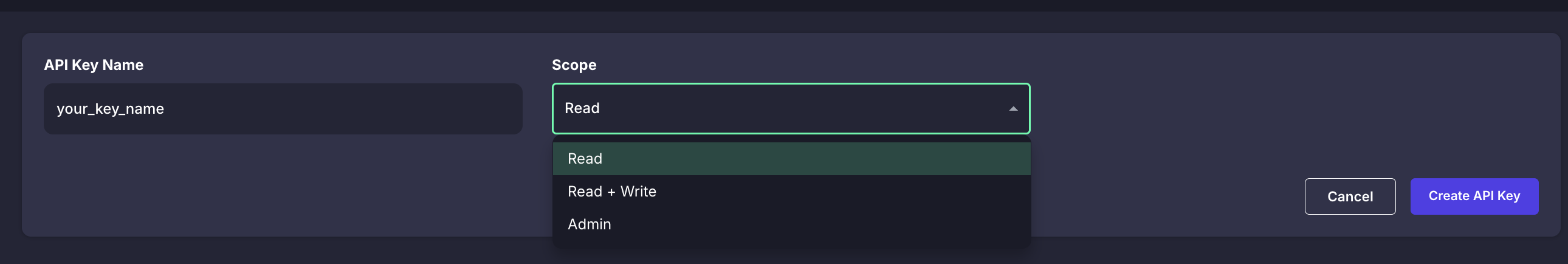 If you don't yet see the scope options (Admin, Read-Write, Read) in your Marqo Cloud account, please contact support and we’ll enable them for you.
